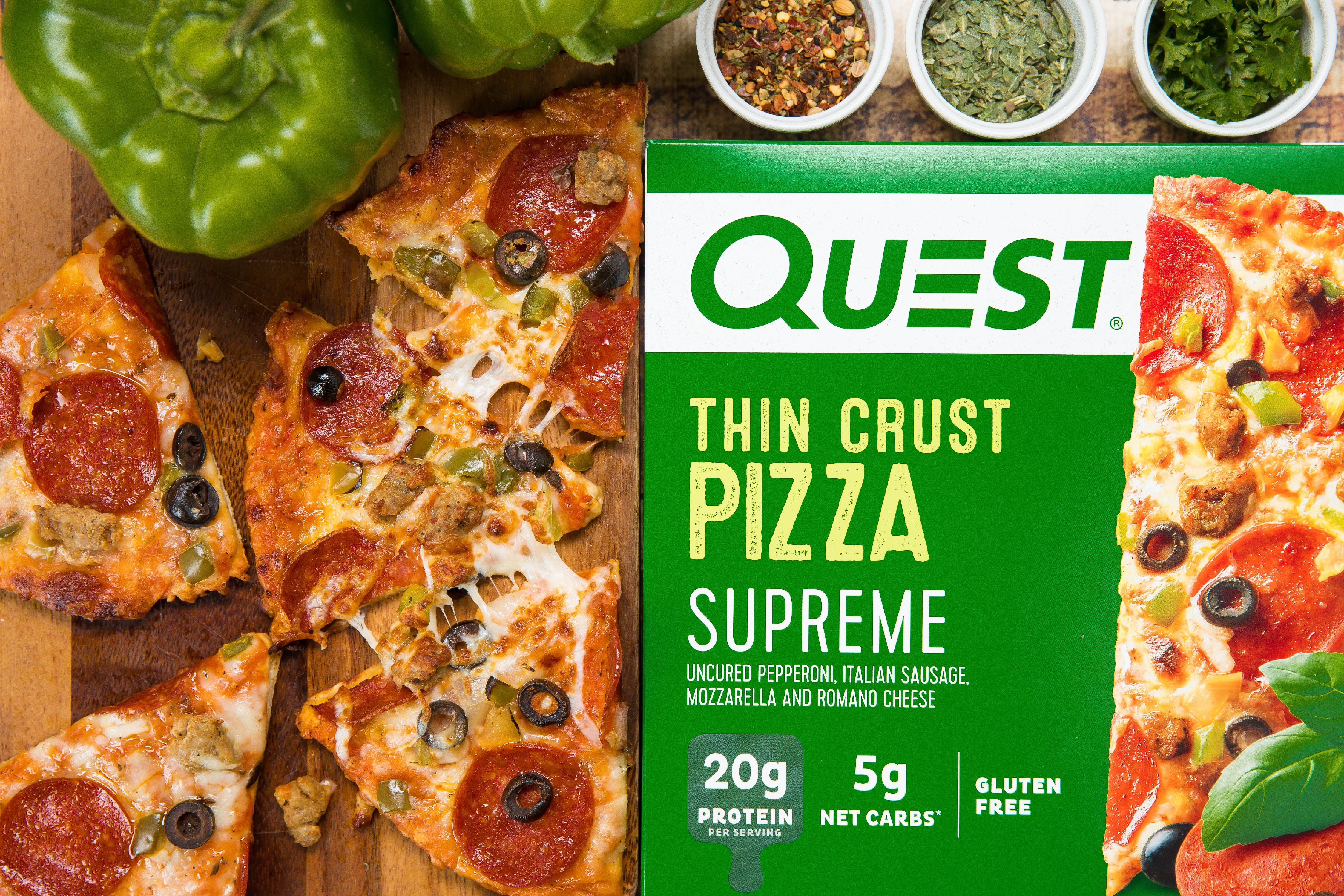 Supreme - Quest Nutrition Pizza is always the right choice when you choose a pie that tastes great but isn't packed with net carbs. Quest® Thin Crust Pizza has a crust that's rich in protein but has just 5-6 grams of net carbs per serving. Quest pizzas have 20-28 grams of protein and are also a delicious source of fiber. It's way bigger than a pizza. It's a Quest!