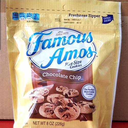 Famous Amos, Chocolate Chip Cookies Nutrition Facts Famous Amos, Chocolate Chip Cookies ; For a Serving Size of 4 cookies (29g) ; How many calories are in Famous Amos, Chocolate Chip Cookies? Amount of calories in ...