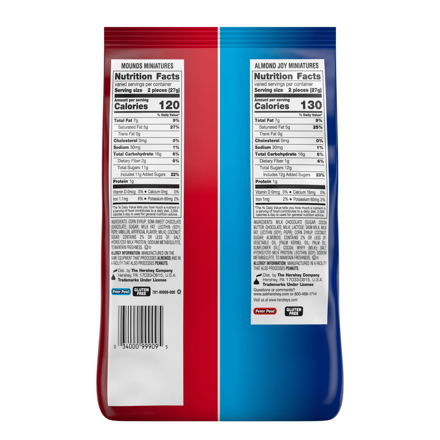 ALMOND JOY - Candy Bar - SmartLabel™ Nutrition Facts 2 servings per container Serving Size 2 pieces (46g) Per Serving Per Container Calories 220 440 % DV* % DV* Total Fat 13g 20% 25g 39% Saturated Fat 9g 43% 17g 85% Trans Fat 0g 0g Cholesterol <5mg 1% <5mg 1% Sodium 50mg 2% 100mg 4% Total Carbohydrate 26g 9% 52g 17% Dietary Fiber 2g 8% 4g 16% Total Sugars 21g 41g Protein 2g 5g ALMOND JOY Coconut and Almond Chocolate Candy Bar - Hersheyland Coconut and Almond Chocolate Candy Bar. Choose a size: Current Size: 1.61 oz. 3.22 oz. 4.8 oz, 8 pack. 9.66 oz, 6 pack. 11.3 oz bag. 20.1 oz jumbo bag. Buy Now. Calories in Almond Joy - Nutritionix Nutrition Facts Almond Joy Serving Size: package 1.76 oz (49g ) Amount Per Serving Calories 235 Calories from Fat 119 % Daily Value* Total Fat 13g 20 % Saturated Fat 8.6g 43 % Polyunsaturated Fat 0.6 g Monounsaturated Fat 2.6 g Cholesterol 2mg 1 % Sodium 70mg 3 % Potassium 124mg 4 % Total Carbohydrates 29g 10 % Dietary Fiber 2.5g 10 % Sugars 24g