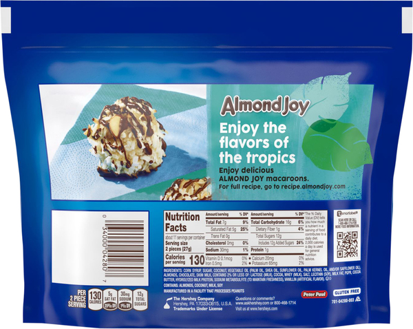Almond joy nutrition facts. Calories in Almond Joy - Nutritionix Nutrition Facts Almond Joy Serving Size: package 1.76 oz (49g ) Amount Per Serving Calories 235 Calories from Fat 119 % Daily Value* Total Fat 13g 20 % Saturated Fat 8.6g 43 % Polyunsaturated Fat 0.6 g Monounsaturated Fat 2.6 g Cholesterol 2mg 1 % Sodium 70mg 3 % Potassium 124mg 4 % Total Carbohydrates 29g 10 % Dietary Fiber 2.5g 10 % Sugars 24g ALMOND JOY Coconut and Almond Chocolate Candy Bar - Hersheyland Coconut and Almond Chocolate Candy Bar. Choose a size: Current Size: 1.61 oz. 3.22 oz. 4.8 oz, 8 pack. 9.66 oz, 6 pack. 11.3 oz bag. 20.1 oz jumbo bag. Buy Now. ALMOND JOY - Candy Bar - SmartLabel™ Nutrition Facts 2 servings per container Serving Size 2 pieces (46g) Per Serving Per Container Calories 220 440 % DV* % DV* Total Fat 13g 20% 25g 39% Saturated Fat 9g 43% 17g 85% Trans Fat 0g 0g Cholesterol <5mg 1% <5mg 1% Sodium 50mg 2% 100mg 4% Total Carbohydrate 26g 9% 52g 17% Dietary Fiber 2g 8% 4g 16% Total Sugars 21g 41g Protein 2g 5g
