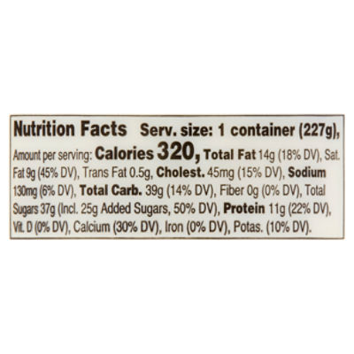 Product Unavailable - Kroger Calories 310 % Daily value* Total Fat 14g 18% Saturated Fat 8g 40% Trans Fat 0.5g 0% Cholesterol 45mg 15% Sodium 115mg 5% Total Carbohydrate 38g 14% Dietary Fiber 0g 0% Sugar 35g 0% Protein 11g 22% Calcium 30% Potassium 10%