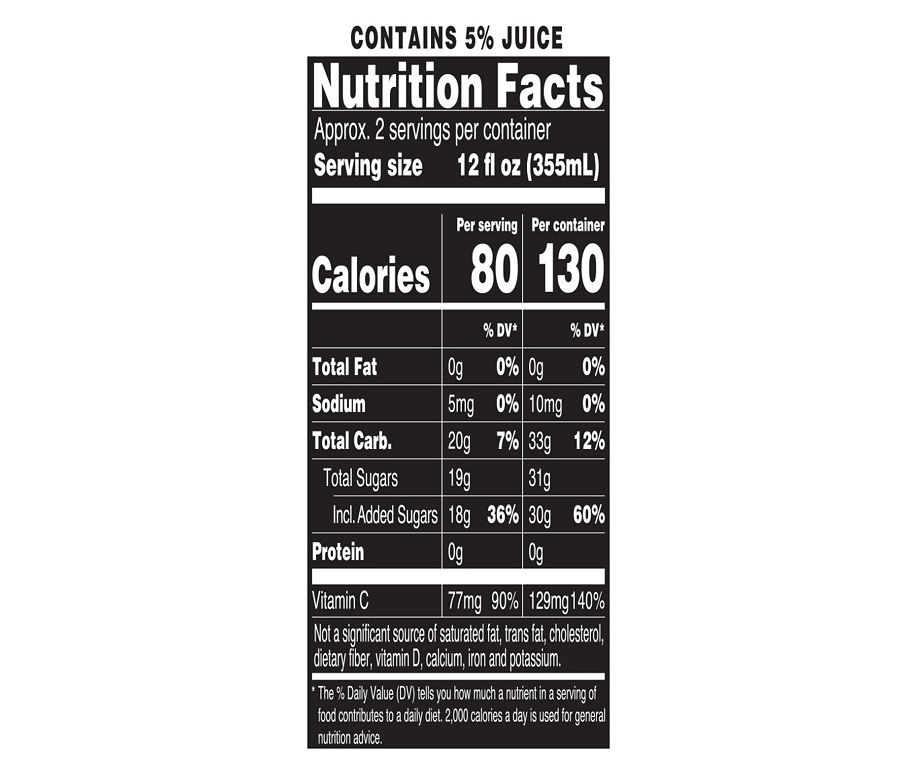 › content-hubLearning to read nutrition labels - Orlando Health Arnold ... A healthy diet is LOW in saturated fat, trans fat, sodium, and added sugar, and HIGH in vitamins, minerals, and fiber. So begin thinking in percentages to consider the 5/20 rule. 5% or less means the food is LOW in that nutrient 20% or more means the food is HIGH in that nutrient Let's talk about the food groups and how to shop using the 5/20 rule. Have you heard? The Nutrition Facts label is getting a facelift. I mean, the food labels were created over 20 years ago and haven't been updated since, other than to add trans fats to the labels. The good news is that there are some big changes on the horizon! The FDA recently proposed bringing the Nutrition Facts label up-to-date with an improved design and updated content. Not only will this positively ... › food › arnold-palmerCalories in Arnold Palmer - Nutritionix Arnold Palmer Arnold Palmer Nutrition Facts Serving Size: serving (8 fl oz) ( 245g ) Arnold Palmer Amount Per Serving Calories 88 % Daily Value* Total Fat 0g 0% Trans Fat 0g Sodium 51mg 2% Total Carbohydrates 22g 8% Dietary Fiber 0g 0% Sugars 22g Protein 0g Calcium 7.4mg 1% Iron 0mg 0% Potassium 46.6mg 1% Caffeine 7.4mg Your nutrition labels are changing- here's what you need to know! 1. Added sugars will now be included! This change is probably what most people are excited about. Added sugars will now be included on the Nutrition Facts label, which will be both listed in grams and in percent daily value.